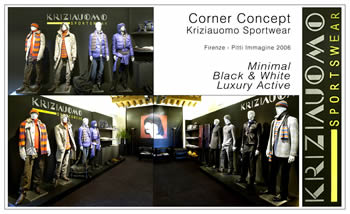 Volumes and shapes were purposely limited to the essential to render the image of Maison Krizia in the new context of Men's Sportswear. Only the product is master of the space. Colour coding is based on black that stands for elegance and determination. The arrangement as a longitudinal show room forms a path that leads to a meeting area. Functionality that is typical of sales areas, is guaranteed.